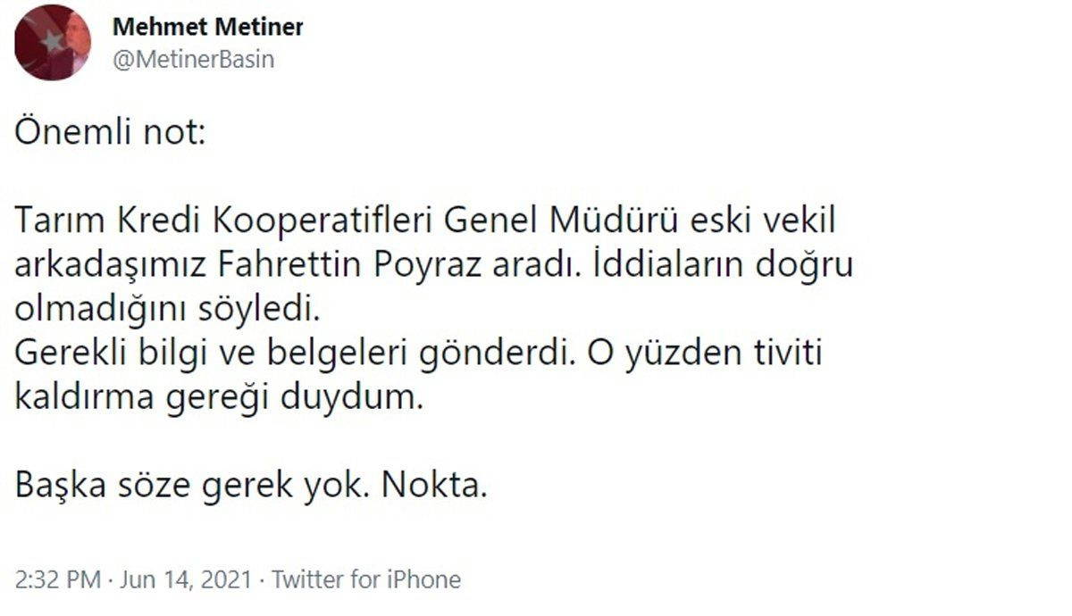 “Tarım Kredi Kooperatifleri Genel Müdürü eski vekil arkadaşımız Fahrettin Poyraz aradı. İddiaların doğru olmadığını söyledi. Gerekli bilgi ve belgeleri gönderdi. O yüzden tiviti kaldırma gereği duydum. Başka söze gerek yok. Nokta.”