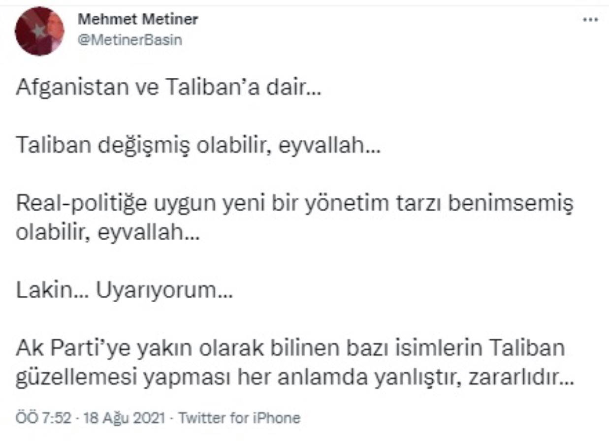 Twitter üzerinden yaptığı paylaşımında "Taliban değişmiş olabilir, eyvallah… Real-politiğe uygun yeni bir yönetim tarzı benimsemiş olabilir, eyvallah…" diyen Metiner, "Lakin… Uyarıyorum…Ak Parti’ye yakın olarak bilinen bazı isimlerin Taliban güzellemesi yapması her anlamda yanlıştır, zararlıdır…" ifadelerini kullandı.