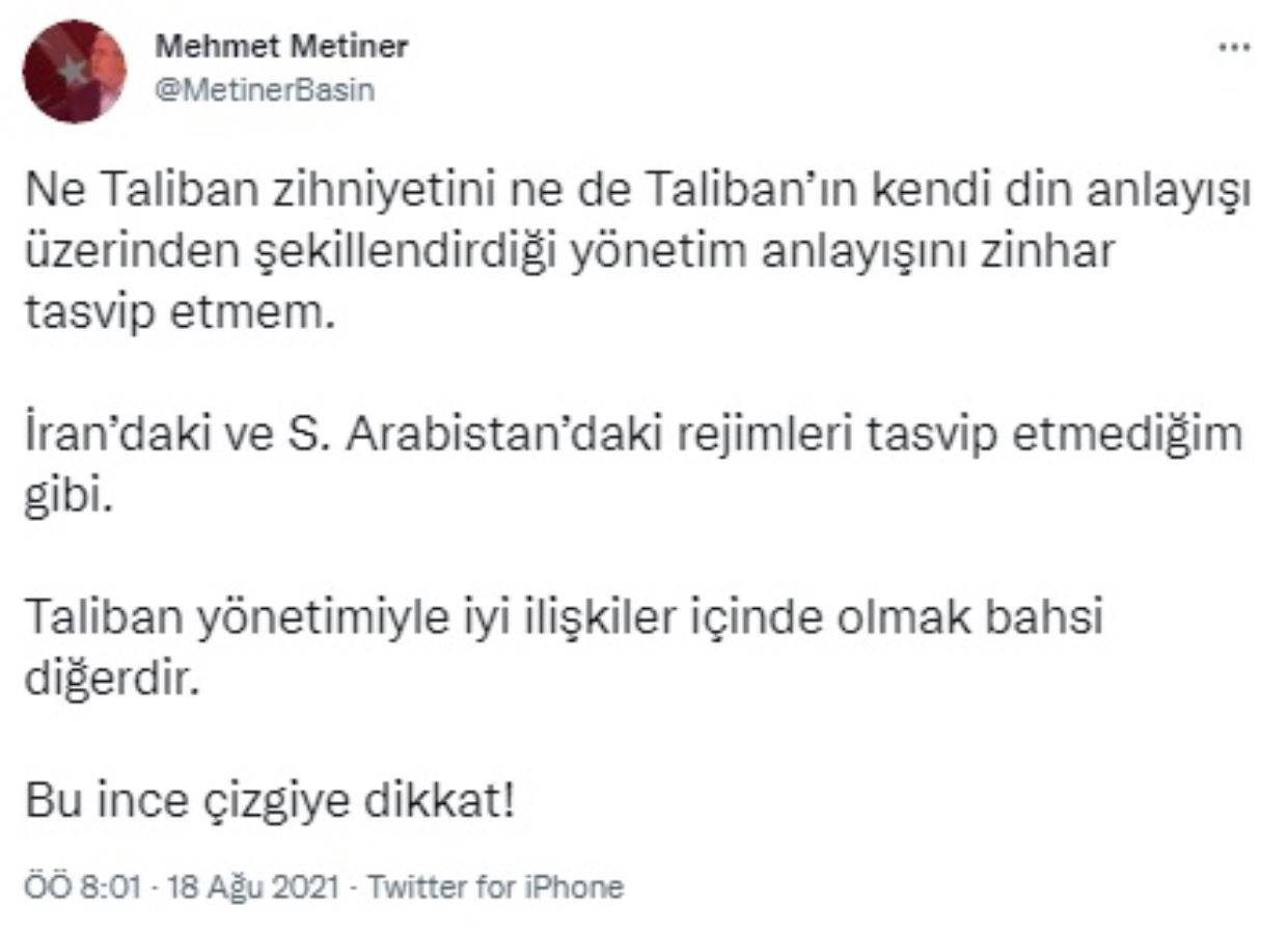 Metiner, bir diğer paylaşımında da "Ne Taliban zihniyetini ne de Taliban’ın kendi din anlayışı üzerinden şekillendirdiği yönetim anlayışını zinhar tasvip etmem. İran’daki ve S. Arabistan’daki rejimleri tasvip etmediğim gibi. Taliban yönetimiyle iyi ilişkiler içinde olmak bahsi diğerdir. Bu ince çizgiye dikkat!" diye yazdı.