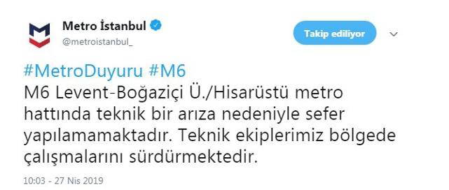 Yapılan açıklamaya göre, M6 Levent-Boğaziçi Üniversitesi-Hisarüstü metro hattında seferler yapılamıyor.
