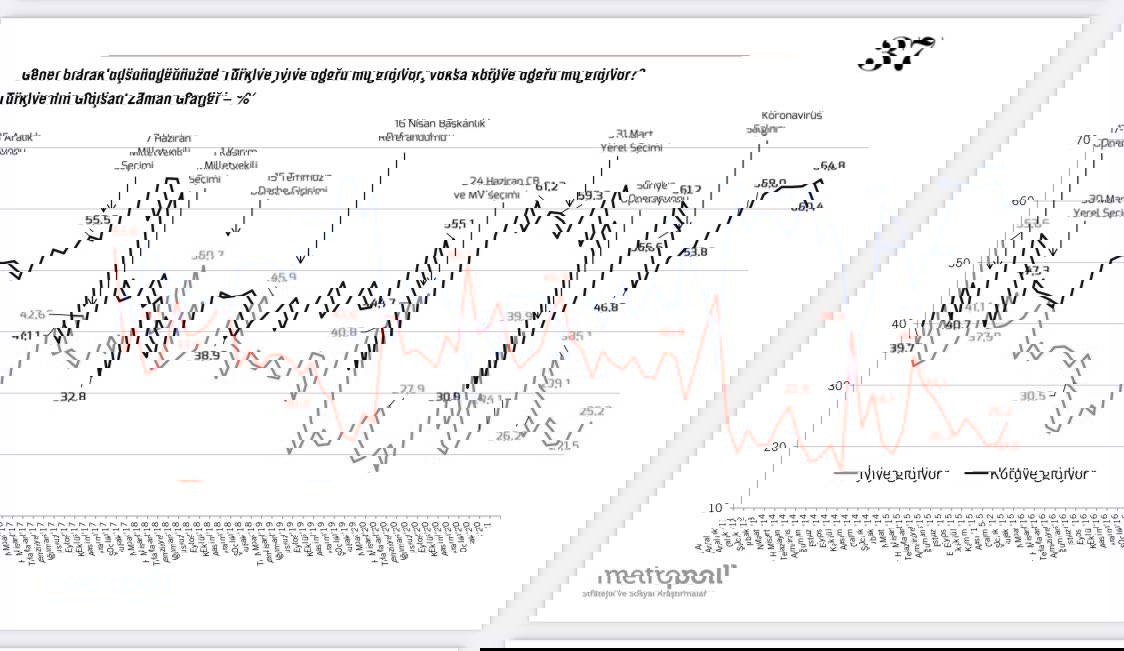 Metropoll Araştırma, ocak ayında yaptığı anketin sonucunu paylaştı. Şirketin başkanı Özer Sencar’ın “Yorumsuz” olarak paylaştığı 'Türkiye’nin gidişatı' anketinin grafiğinde halkın gidişattan memnun olmadığı net biçimde görülüyor.