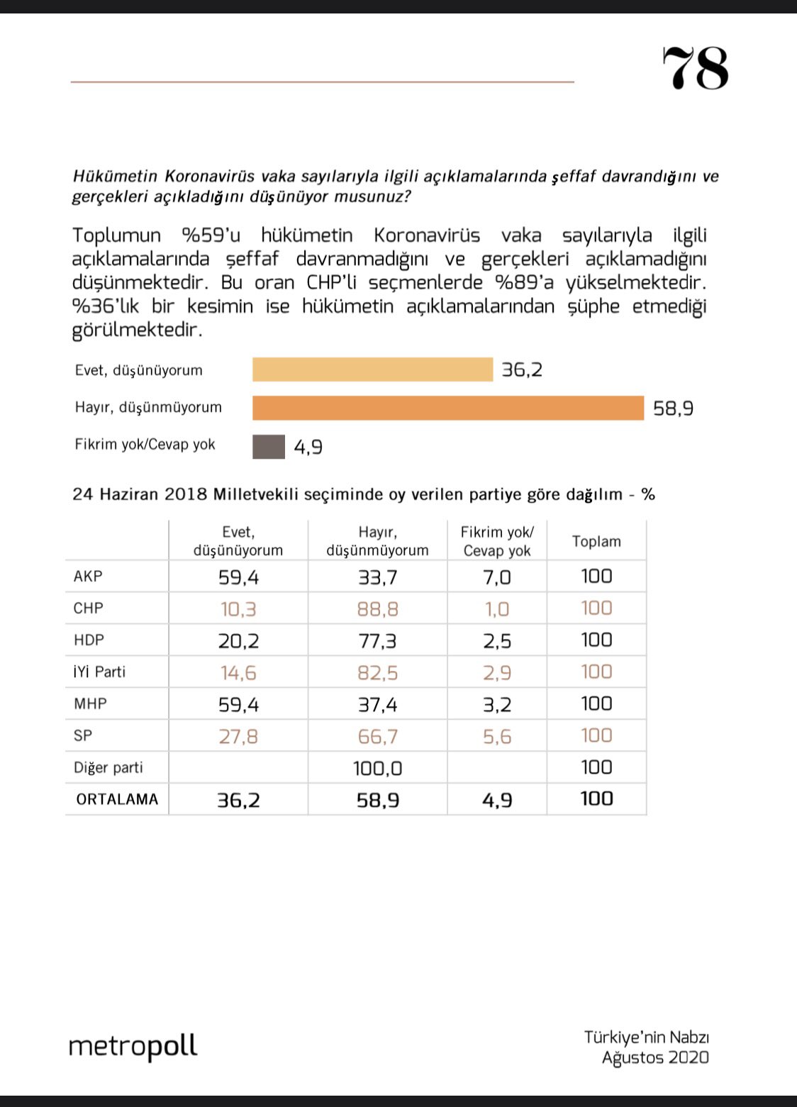 Yurttaşlara "Hükümetin koronavirüs vaka sayılarıyla ilgili açıklamarında şeffaf davrandığını ve gerçekleri açıkladığını düşünüyormusunuz?" sorusunun sorulduğu araştırmada toplumun yaklaşık %60’ının hükümetin koronavirüs salgınına ilişkin açıklamalarına güven duymadığı ortaya çıktı.