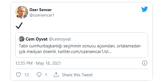 MetroPOLL'ün CEO'su Özer Sencar, Twitter hesabından yaptığı paylaşımda Cumhurbaşkanlığı seçimi yönünden medyanın daha önemli olduğu yönündeki bir yoruma da katıldığını belirtti.