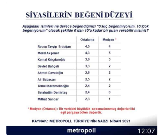 MetroPOLL Araştırma şirketinin sahibi Özer Sencar, 'Türkiye’nin Nabzı' araştırmasının nisan sonuçlarından 'siyasilerin beğeni düzeyi' bölümünü paylaştı. Buna göre; AKP Genel Başkanı Recep Tayyip Erdoğan’ın beğeni düzeyi, 0 ila 10 arasından 4,5 olurken, İYİ Parti lideri Meral Akşener’inki 4,3 olarka çıktı. Ancak medyanda Akşener, Erdoğan'dan bir puan önde.