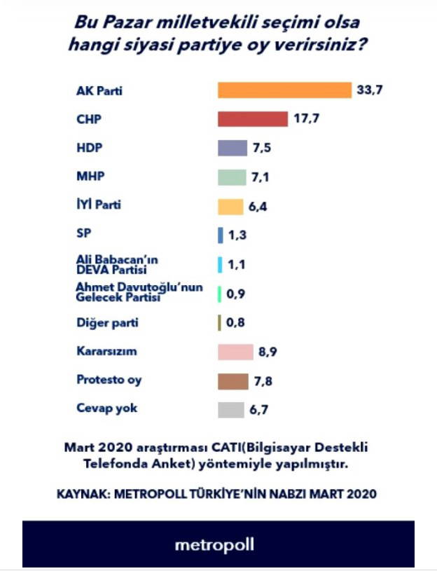 MetroPOLL, “Bu pazar seçim olsa hangi partiye oy verirsiniz?” sorusu üzerinden seçmenlerin görüşü üzerine dikkat çekici bir araştırma yaptı. Mart 2020’da düzenlenen anketin sonuçlarına göre iktidardaki AKP yüzde 33.7 ile birinci sırada. AK Parti’yi yüzde 17.7’lik oy oranı ile CHP takip ediyor. Ankete göre HDP 7.5; MHP, 7.1; İyi Parti 6.4 oranında oy alıyor. Ali Babacan Genel Başkanı olduğu Deva Partisi yüzde 1.1 oy alırken, Ahmet Davutoğlu’nun Genel Başkan olduğu Gelecek Partisi ise 0.9 oranında oy alıyor.