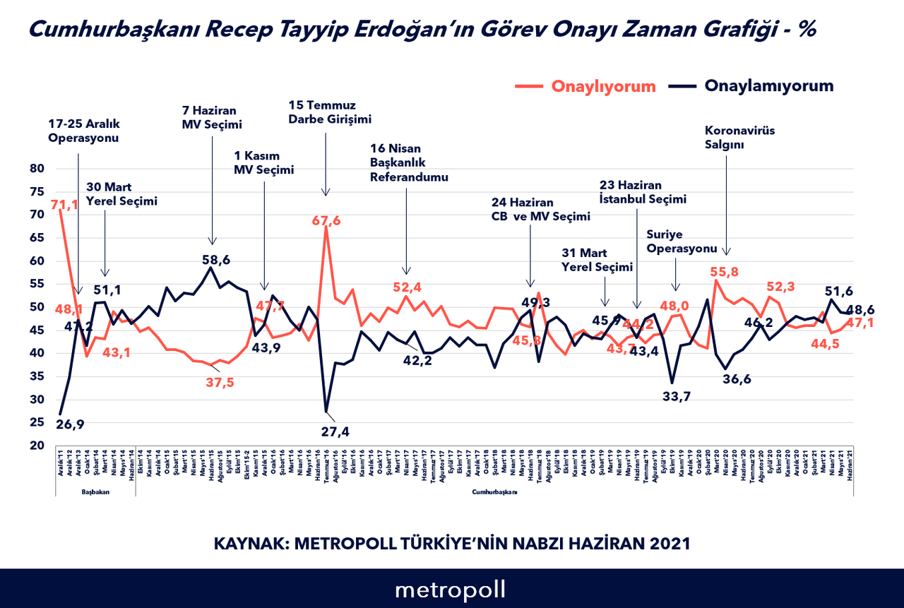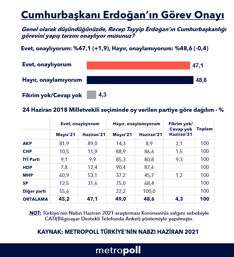 ‘Türkiye’nin Nabzı Haziran 2021’ anketine göre AKP'li Cumhurbaşkanı Erdoğan’ın görevini yapış tarzını onaylayanların oranı yüzde 47,1 iken, onaylamayanların oranı ise yüzde 48,6.