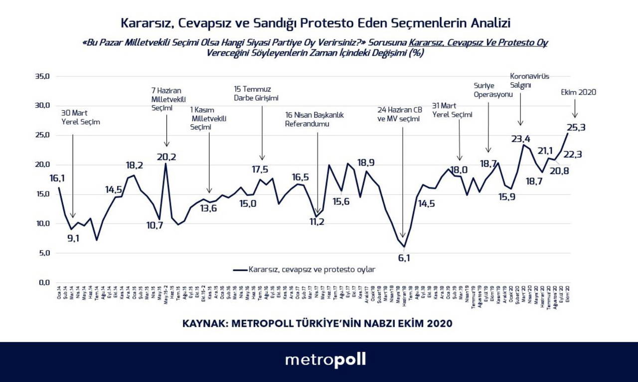 Metropoll Araştırma şirketinin sahibi Özer Sencar, tabloyu sosyal medya hesabından paylaşarak, “Metropoll’ün 2014-2020 sürecindeki aylık araştırmalarında kararsızların değişimi. Tesbit edilen en yüksek değer %25,2” notunu düştü.