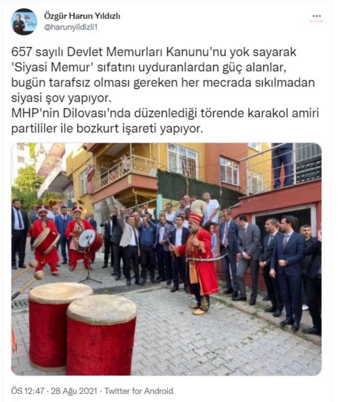 “657 sayılı Devlet Memurları Kanunu'nu yok sayarak ‘Siyasi Memur’ sıfatını uyduranlardan güç alanlar, bugün tarafsız olması gereken her mecrada sıkılmadan siyasi şov yapıyor. MHP'nin Dilovası'nda düzenlediği törende karakol amiri partililer ile bozkurt işareti yapıyor.”