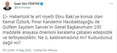 "1)- Habertürk’te art niyetli Ebru Baki’ye konuk olan Kemal Öztürk, Pınar Kandemir Hacıbektaşoğlu ile Gülfem Saydam Sanver’in Genel Başkanımızın 100 maddelik anayasa önerisini karalama çabaları edepsizlik ve terbiyesizliktir. Ne o, kaldıramadınız mı? Kudurdunuz değil mi?