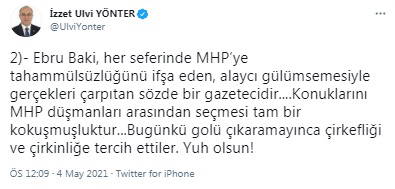 2)- Ebru Baki, her seferinde MHP’ye tahammülsüzlüğünü ifşa eden, alaycı gülümsemesiyle gerçekleri çarpıtan sözde bir gazetecidir....Konuklarını MHP düşmanları arasından seçmesi tam bir kokuşmuşluktur...Bugünkü golü çıkaramayınca çirkefliği ve çirkinliğe tercih ettiler. Yuh olsun!”