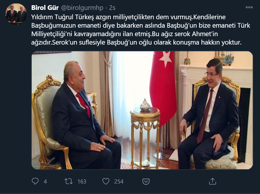 MHP İstanbul İl Başkanı Birol Gür, Tuğrul Türkeş’e “Yıldırım Tuğrul Türkeş azgın milliyetçilikten dem vurmuş. Kendilerine Başbuğumuzun emaneti diye bakarken aslında Başbuğ’un bize emaneti Türk Milliyetçiliği’ni kavrayamadığını ilan etmiş. Bu ağız serok Ahmet’in ağzıdır. Serok’un suflesiyle Başbuğ’un oğlu olarak konuşma hakkın yoktur” sözleriyle yüklendi.