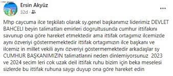 Zonguldak Çaycuma'da MHP İlçe Başkanı Ersin Akyüz, sosyal medya hesabından yaptığı paylaşımda, partisinin ittifak ortağı AKP'nin ilçede yeterli özveriyi göstermediğinden şikayet etti. Akyüz, AKP'nin ilçe başkanı ve milletvekiline seslenen Akyüz, " Arkadaşlar Sayın Cumburbaşkanımızı talimatlarını neden dinlemiyorsunuz?" diye sorup seçimlerin çok uzak olmadığına dikkat çekti.