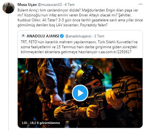 "Bülent Arınç’ı kim canlandırıyor dizide? Mağdurlardan Engin Alan paşa var mı? Kozinoğlu’nun infaz emrini veren Enver Altaylı olacak mı? Şehitler, Kuddusi Okkır, Ali Tatar? 3-5 gün önce tarihli gazetelere sarılı ama yıllar önce gömülmüş denilen boş LAV kovanları, Poyrazköy falan?
