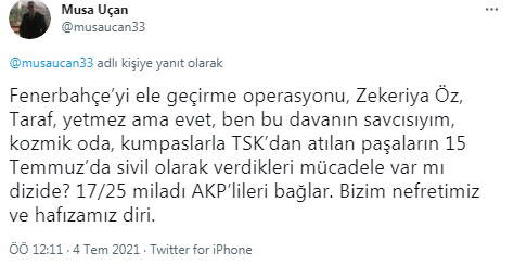Fenerbahçe’yi ele geçirme operasyonu, Zekeriya Öz, Taraf, yetmez ama evet, ben bu davanın savcısıyım, kozmik oda, kumpaslarla TSK’dan atılan paşaların 15 Temmuz’da sivil olarak verdikleri mücadele var mı dizide? 17/25 miladı AKP’lileri bağlar. Bizim nefretimiz ve hafızamız diri.