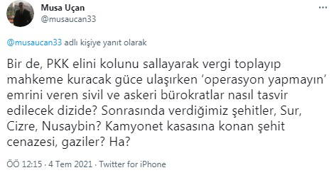 Bir de, PKK elini kolunu sallayarak vergi toplayıp mahkeme kuracak güce ulaşırken ‘operasyon yapmayın’ emrini veren sivil ve askeri bürokratlar nasıl tasvir edilecek dizide? Sonrasında verdiğimiz şehitler, Sur, Cizre, Nusaybin? Kamyonet kasasına konan şehit cenazesi, gaziler? Ha?"