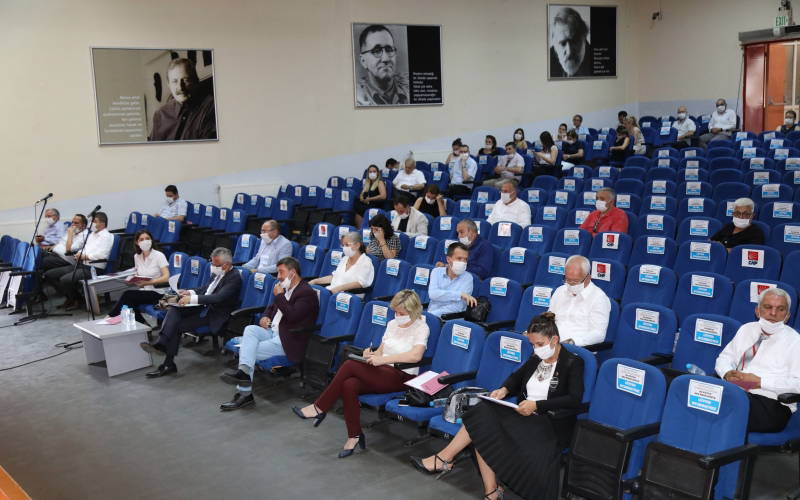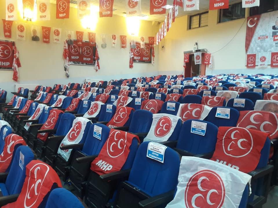 İz Gazete'den Gizem Taban'ın haberine göre, salonun sahne önünde yer alan "Nazım Hikmet Sahnesi" yazısı da MHP Genel Başkanı Devlet Bahçeli’nin afişleri ve parti bayraklıyla örtüldü.