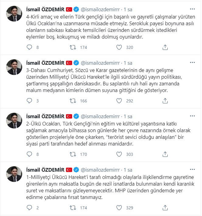 Ne var ki Sözcü, Karar, Fitneçağ gibi medyada yuvalanmış ve uyduruk sütre gerisinden efelik taslayan birtakım Ülkücü muarızları, fırsatı ganimet bilerek söz konusu hadiseyi kaşımaya, ‘siyasi etik’ üzerinden de MHP’yi hedefe koymaya çalışmaktadır.