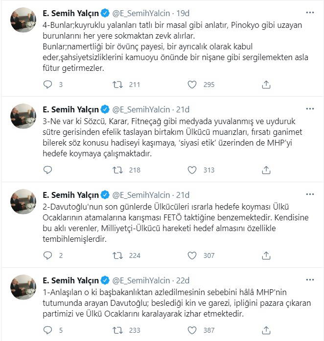 Semih Yalçın ise paylaştığı peş peşe mesajlarda Gelecek Partisi Genel Başkan Yardımcısı Selçuk Özdağ'a yönelik saldırının şüphelilerinden Gülahmet Gül'ün Bursa Ülkü Ocakları Başkanı yapılmasını eleştirenleri hedef aldı. MHP'li Yalçın, saldırı şüphelisi Gül'ün ülkü ocakları başkanı yapılmasını haberleştiren basın yayın organlarını ve Gelecek Partisi Genel Başkanı Ahmet Davutoğlu'nu hedef gösterdi.