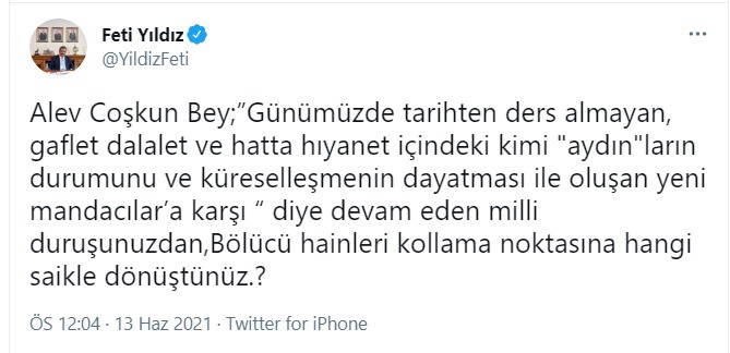 Feti Yıldız, sosyal medya hesabından paylaştığı mesajla bugün gazetemizde 'Suskunluk Politikası' başlıklı bir yazı kaleme alan Alev Coşkun'u hedef gösterdi.
