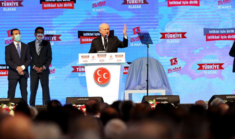 Muhalefete yüklenen Bahçeli, "Türkiye'nin karşısında hizalanmak muhalefet değildir. Millet başka, zillet başkadır. Türkiye'yi uçuruma çekmek demokrasi değildir. HDP, Türk demokrasisinin çevresini sarmış mayın tarlasıdır, CHP beşinci kol faaliyetidir, İYİ Parti, Türkiye'nin kötülüğüne hizmetkarlık yapan uzaktan kumanda ile kontrol edilen melanet bir projedir. İP'in başkanı Cumhur İttifakı için etle tırnak gibi demiş. Kendilerinin proje bazlı ittifak olduğunu açık itiraf etmiştir. Bu neyin projesidir, hazırlayanlar kimlerdir? Doğrudur, Cumhur İttifakı kader birlikteliğidir. Zalimlere, terör örgütlerine, ekonomik tetikçilere karşı tek ses, tek nefes, tek bilek, tek yürekle duruş gösteren cumhurun köküdür. Cumhur İttifakı'nı arayan Pensilvanya'da, Kandil'de değil, başkent Ankara'da dünyaya Türkçe bakan iradenin sağlam ahlakında bulacaktır" ifadelerini kullandı.