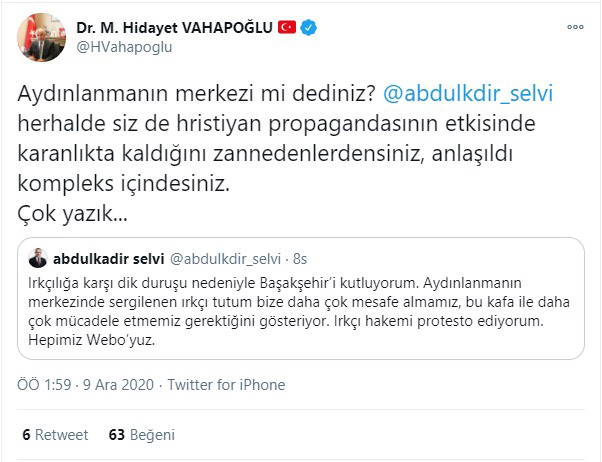 Dün yaşanan PSG-Başakşehir müsabakasındaki ırkçılığa tepki gösteren Abdulkadir Selvi, "Irkçılığa karşı dik duruşu nedeniyle Başakşehir’i kutluyorum. Aydınlanmanın merkezinde sergilenen ırkçı tutum bize daha çok mesafe almamız, bu kafa ile daha çok mücadele etmemiz gerektiğini gösteriyor. Irkçı hakemi protesto ediyorum. Hepimiz Webo’yuz" dedi.
