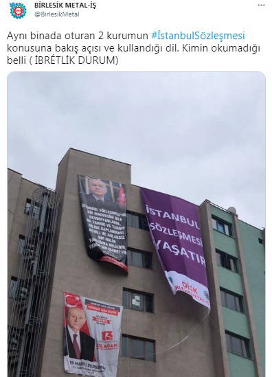 Kocaeli'de DİSK'e bağlı Birleşik Metal-İş Sendikası'nın şube binasına "İstanbul Sözleşmesi yaşatır" pankartı asmasının ardından aynı binada bulunan MHP, Devlet Bahçeli'nin ifadelerinin olduğu ve İstanbul Sözleşmesi'ni hedef alan sözlerini astı.