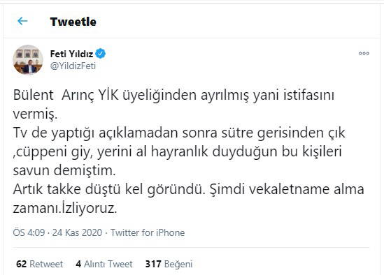 ''Bülent Arınç YİK üyeliğinden ayrılmış yani istifasını vermiş. Tv’de yaptığı açıklamadan sonra sütre gerisinden çık, cüppeni giy, yerini al hayranlık duyduğun bu kişileri savun demiştim. Artık takke düştü kel göründü. Şimdi vekaletname alma zamanı. İzliyoruz.''