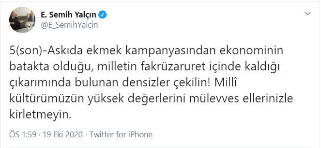 Yalçın, ‘askıda ekmek’ kampanyasından ekonominin batakta olduğu, milletin fakrüzaruret içinde kaldığı çıkarımında bulunulmaması gerektiğini belirterek, şu paylaşımı yaptı: