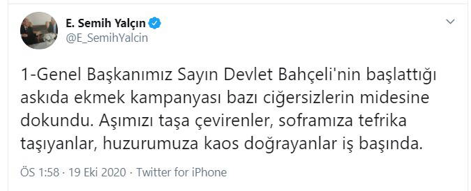 “Genel Başkanımız Sayın Devlet Bahçeli'nin başlattığı askıda ekmek kampanyası bazı ciğersizlerin midesine dokundu. Aşımızı taşa çevirenler, soframıza tefrika taşıyanlar, huzurumuza kaos doğrayanlar iş başında. Haramla beslenip zehir kusan tipler helal lokmanın değerini ne bilsin! Kimselere ahvalini açmadan ihtiyacını gidermenin tat ve saffetini utanmazlar nasıl hissetsin!
