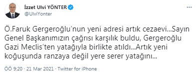 "Ömer Faruk Gergeroğlu’nun yeni adresi artık cezaevi" diyen Yönter, "Sayın Genel Başkanımızın çağrısı karşılık buldu, Gergeroğlu Gazi Meclis’ten yatağıyla birlikte atıldı... Artık yeni koğuşunda ranzaya değil yere serer yatağını..." ifadelerini kullandı.