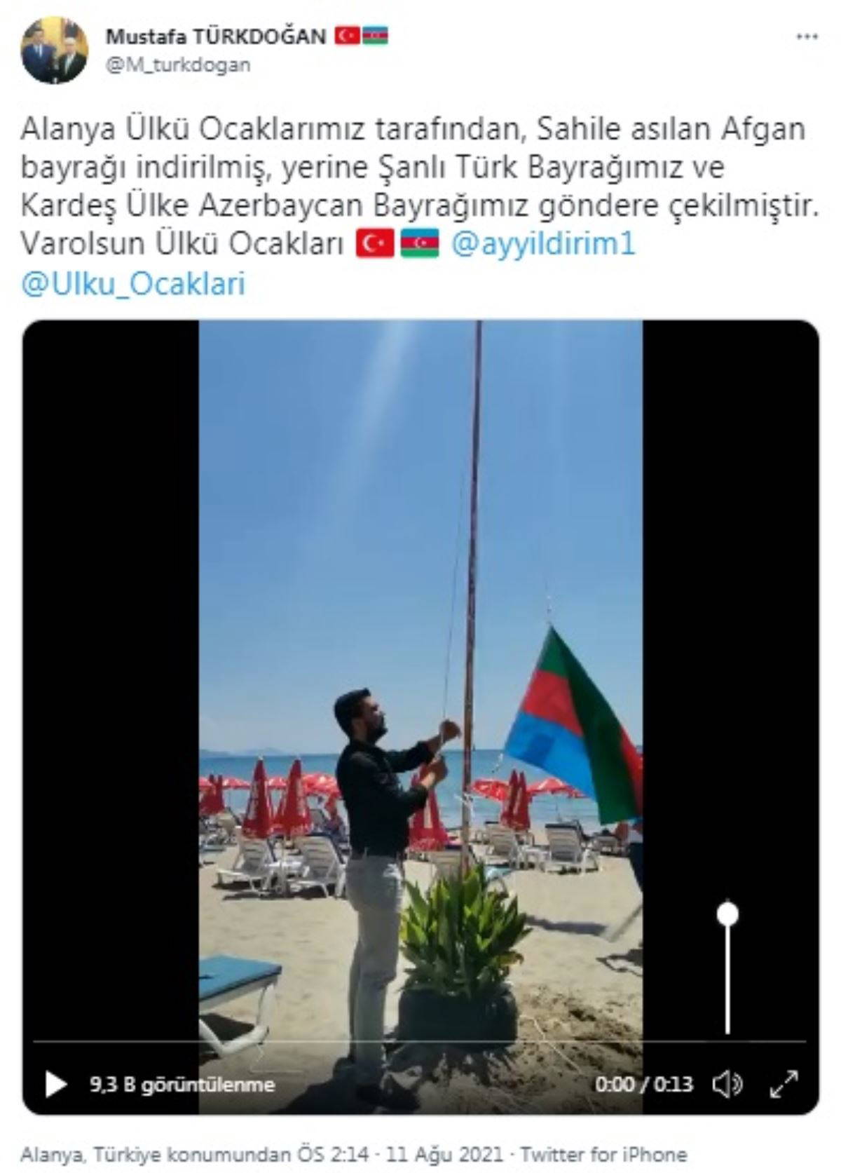 Türkdoğan, paylaşımında "Alanya Ülkü Ocaklarımız tarafından, Sahile asılan Afgan bayrağı indirilmiş, yerine Şanlı Türk Bayrağımız ve Kardeş Ülke Azerbaycan Bayrağımız göndere çekilmiştir. Varolsun Ülkü Ocakları" ifadelerini kullandı.