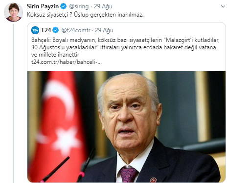 Payzın'ın Bahçeli paylaşımına yorum yapan Şişman, "Bülbül yuvasının ,kapana kısılmış, suyun öbür yakasının köksüz ,lağımcıları, Türk vatanında yaptıklarınız ,yapacaklarınız için anlayacağınız dilden the end, Türk'ün kökleri sizleri sardıkça kuduracaksınız, nefes alamayacaksınız" ifadesini kullandı.