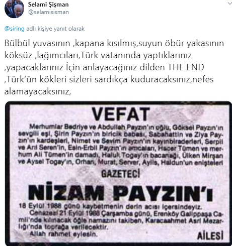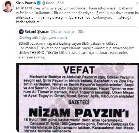 MHP Merkez Yönetim Kurulu Üyesi Selami Şişman, T24 yazar ve programcısı Şirin Payzın'ı babası Nizam Payzın'ın vefat ilanını paylaşarak tehdit etti.