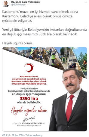 Yeni yıl itibariyle Belediyemizin imkanları doğrultusunda en düşük işçi maaşımızı 3350 lira olarak belirledik. Hayırlı uğurlu olsun." ifadeleriyle duyurdu.