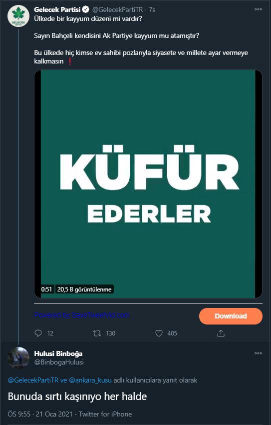 Gelecek Partisi’ne ait resmi twitter hesabından parti sözcüsü Serkan Özcan’ın açıklamaları paylaşıldı. Özcan MHP’li isim tarafından Twitter’da tehdit edildi.