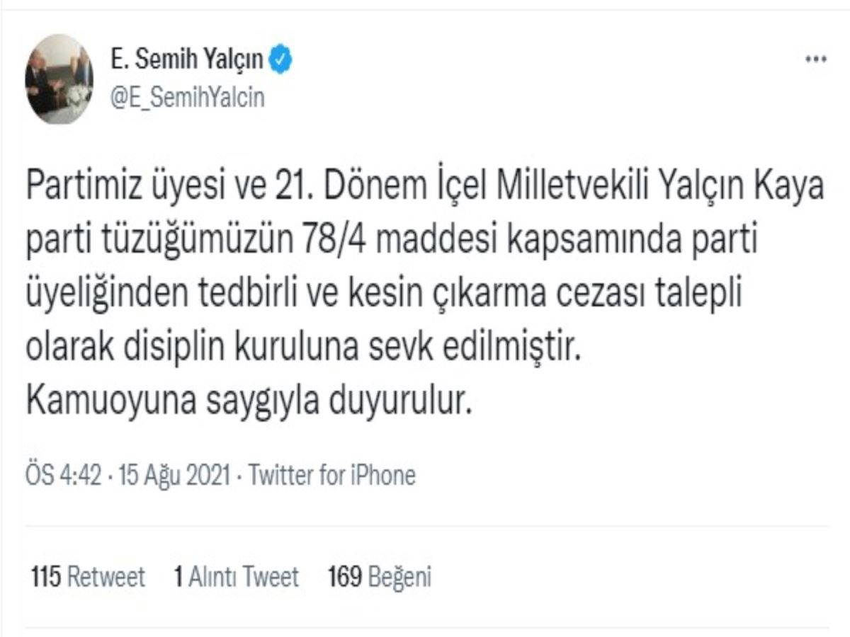 MHP Genel Başkan Yardımcısı Semih Yalçın, yaptığı açıklamada Yalçın Kaya'nın disiplin kuruluna sevk edildiğini açıkladı. Yalçın mesajında, "Partimiz üyesi ve 21. Dönem İçel Milletvekili Yalçın Kaya parti tüzüğümüzün 78/4 maddesi kapsamında parti üyeliğinden tedbirli ve kesin çıkarma cezası talepli olarak disiplin kuruluna sevk edilmiştir" ifadelerini kullandı.