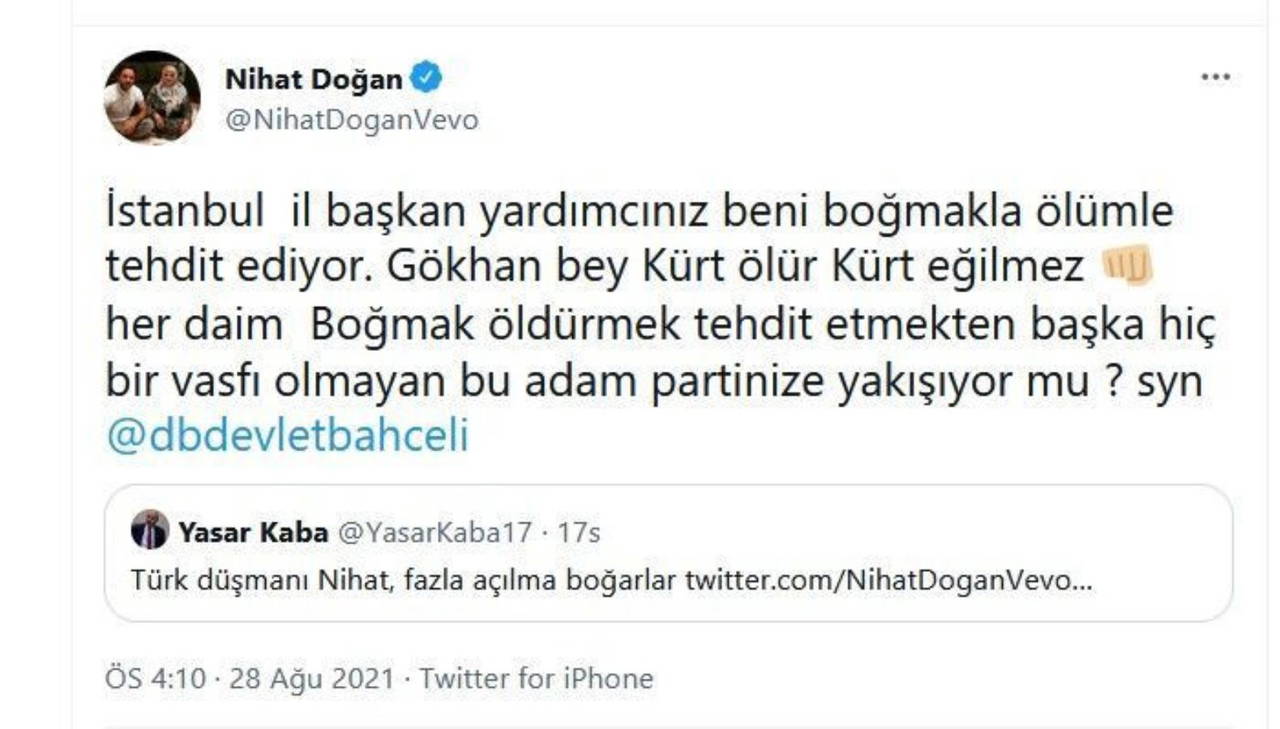 Doğan, Bahçeli'yi etiketlediği paylaşımında, "İstanbul il başkan yardımcınız beni boğmakla ölümle tehdit ediyor. Gökhan bey Kürt ölür Kürt eğilmez Yumruk yapılmış el her daim Boğmak öldürmek tehdit etmekten başka hiç bir vasfı olmayan bu adam partinize yakışıyor mu ? syn @dbdevletbahceli" açıklamasında bulundu.
