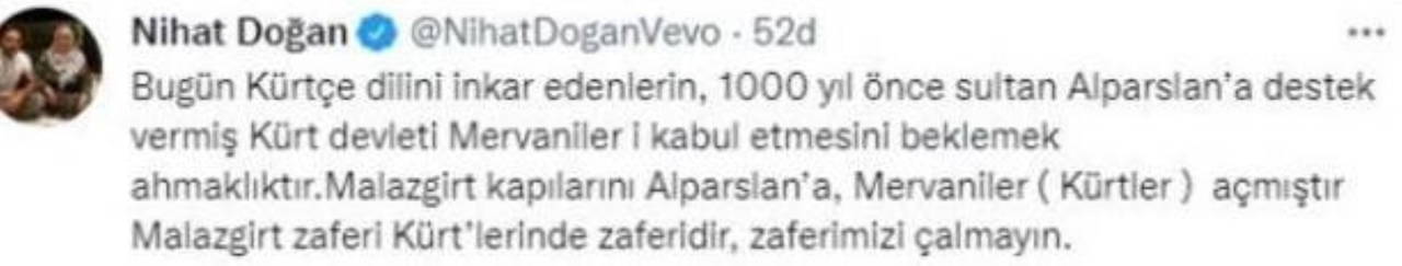 "Bugün Kürtçe dilini inkar edenlerin, 1000 yıl önce Sultan Alparslan’a destek vermiş Kürt devleti Mervaniler'i kabul etmesini beklemek ahmaklıktır." diyen Doğan, "Malazgirt kapılarını Alparslan’a, Mervaniler (Kürtler) açmıştır Malazgirt Zaferi Kürtlerin de zaferidir, zaferimizi çalmayın."