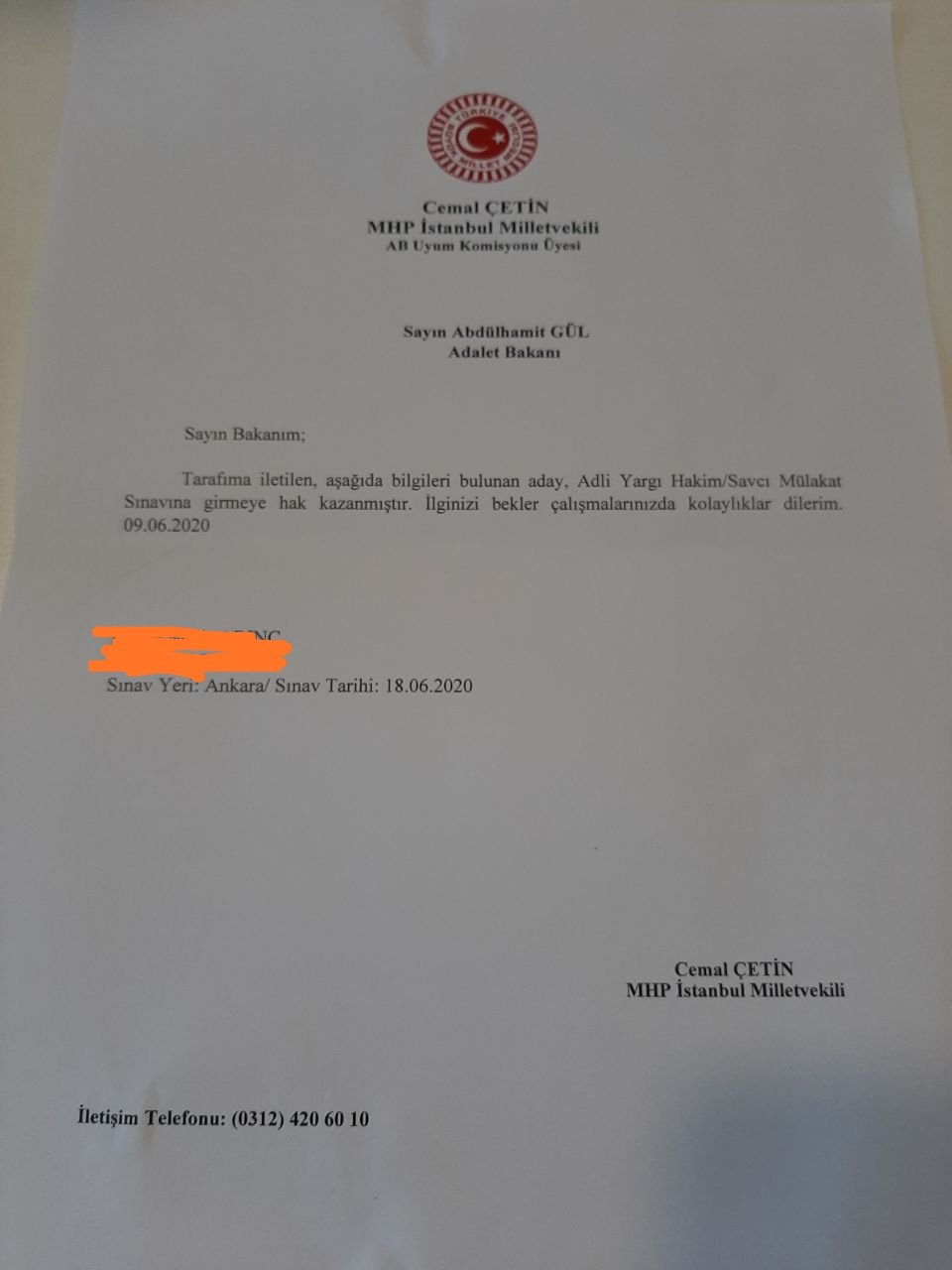 MHP İstanbul Milletvekili Cemal Çetin tarafından Hakim/Savcı Mülakat sınavına girecek bir aday için Adalet Bakanı Abdülhamit Gül'e gönderilmesi gereken belge yanlışlıkla HDP'li bir vekilin odasına gidince 'torpil ricası' ortaya çıktı.