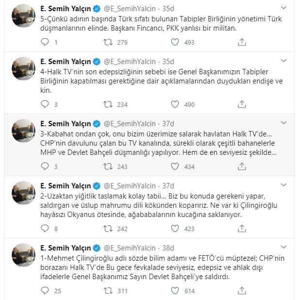 "Mehmet Çilingiroğlu adlı sözde bilim adamı ve FETÖ’cü müptezel, CHP’nin borazanı Halk TV’de bu gece fevkalade seviyesiz, edepsiz ve ahlak dışı ifadelerle Genel Başkan'ımız sayın Devlet Bahçeli’ye saldırdı" diyen MHP'li Yalçın, "Uzaktan yiğitlik taslamak kolay tabii… Biz bu konuda gerekeni yapar, saldırgan ve üslup mahrumu dili kökünden koparırız" ifadelerini kullandı.