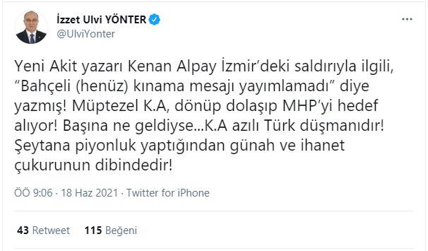 Yeni Akit yazarı Kenan Alpay İzmir’deki saldırıyla ilgili, “Bahçeli (henüz) kınama mesajı yayımlamadı” diye yazmış! Müptezel K.A, dönüp dolaşıp MHP’yi hedef alıyor! Başına ne geldiyse... K.A azılı Türk düşmanıdır! Şeytana piyonluk yaptığından günah ve ihanet çukurunun dibindedir!