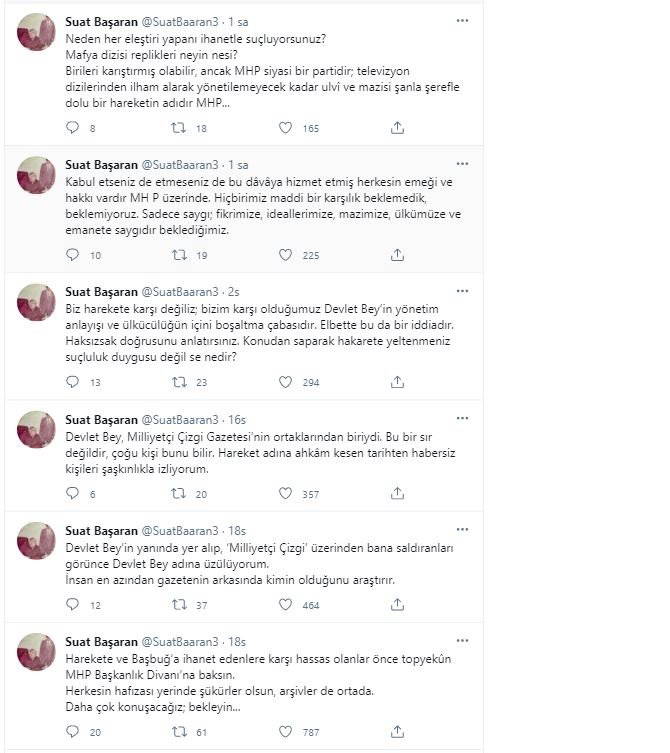 Başaran, ''Devlet Bey, Milliyetçi Çizgi Gazetesi'nin ortaklarından biriydi. Bu bir sır değildir, çoğu kişi bunu bilir. Hareket adına ahkâm kesen tarihten habersiz kişileri şaşkınlıkla izliyorum. Devlet Bey'in yanında yer alıp, 'Milliyetçi Çizgi' üzerinden bana saldıranları görünce Devlet Bey adına üzülüyorum. İnsan en azından gazetenin arkasında kimin olduğunu araştırır. Harekete ve Başbuğ'a ihanet edenlere karşı hassas olanlar önce topyekûn MHP Başkanlık Divanı'na baksın. Herkesin hafızası yerinde şükürler olsun, arşivler de ortada. Daha çok konuşacağız; bekleyin'' açıklamasını yaptı.