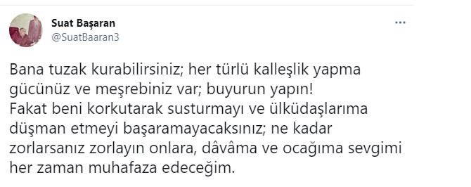 Yıldırım'a tepkisini sürdüren Başaran, son paylaşımında da, "Bana tuzak kurabilirsiniz; her türlü kalleşlik yapma gücünüz ve meşrebiniz var; buyurun yapın! Fakat beni korkutarak susturmayı ve ülküdaşlarıma düşman etmeyi başaramayacaksınız; ne kadar zorlarsanız zorlayın onlara, dâvâma ve ocağıma sevgimi her zaman muhafaza edeceğim" dedi.