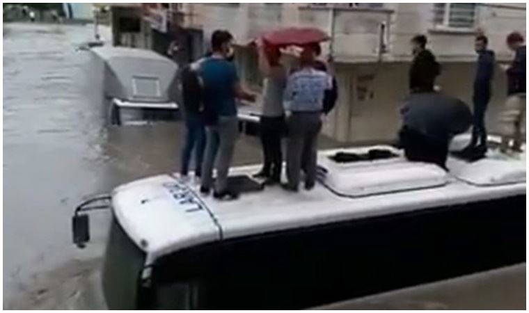 Meteoroloji Genel Müdürlüğü’nün şiddetli yağmur konusunda dün uyardığı İstanbul’da sağanak yağmur etkili oldu. Esenyurt’ta etkili olan şiddetli yağmur taşkınlara neden oldu. İlçede bir su kanalının taşması sonucu birçok ev su altında kadı. Bir sokak üzerinde ise midibüsün içerisinde bulunanlar mahsur kaldı. Yolcular, sel sularının midibüsün yarısına kadar çıkması üzerine midibüsün üstünde bulunan pencereden yukarı çıktı. Mahsur kalan yaklaşık 10 kişi kurtarılmayı bekliyor.