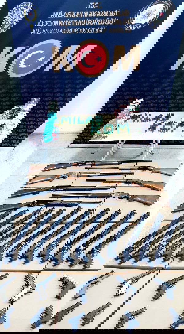 Milas Emniyet Müdürlüğü KOM Grup Amirliği ekipleri, yapılan istihbari çalışma kapsamında bir iş yerine operasyon düzenlendi. İş yerinde yapılan aramada 11 pompalı tüfek, 7 yivsiz av tüfeği, 10 kurusıkı tabanca ile 1375 av tüfeği fişeği ve 650 kurusıkı tabanca fişeği ele geçirildi.
