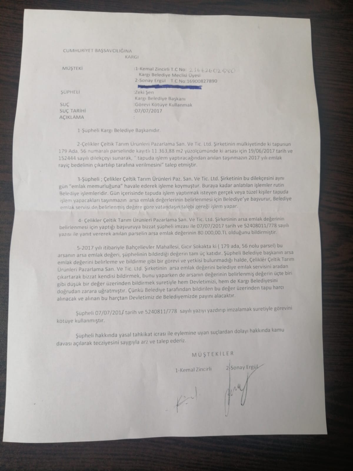 Cumhuriyet Halk Partisi Kargı İlçe başkanı Hakan Çelik ile İYİ Parti Kargı İlçe başkanı Numan Moral, Kargı’da bir arsanın fiyatını üç kat düşük gösterdiği gerekçesiyle görevine kötüye kullanmaktan Belediye Başkanı Zeki Şen hakkında Kargı Cumhuriyet savcılığına suç duyurusunda bulundu.
