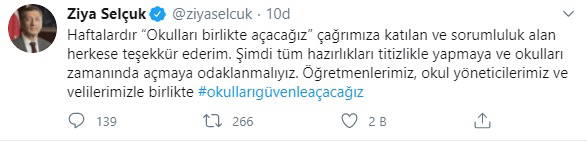 "Haftalardır “Okulları birlikte açacağız” çağrımıza katılan ve sorumluluk alan herkese teşekkür ederim. Şimdi tüm hazırlıkları titizlikle yapmaya ve okulları zamanında açmaya odaklanmalıyız. Öğretmenlerimiz, okul yöneticilerimiz ve velilerimizle birlikte #okullarıgüvenleaçacağız"
