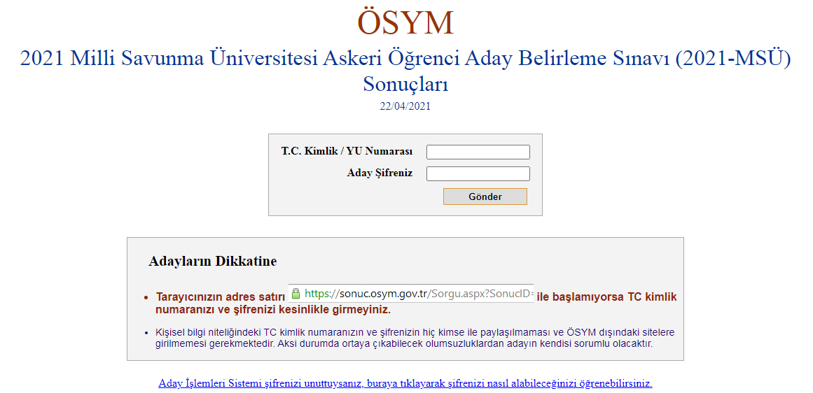 Ölçme, Seçme ve Yerleştirme Merkezi (ÖSYM),Milli Savunma Üniversitesi Askeri Öğrenci Aday Belirleme Sınavı (2021-MSÜ) sonuçlarını açıkladı.