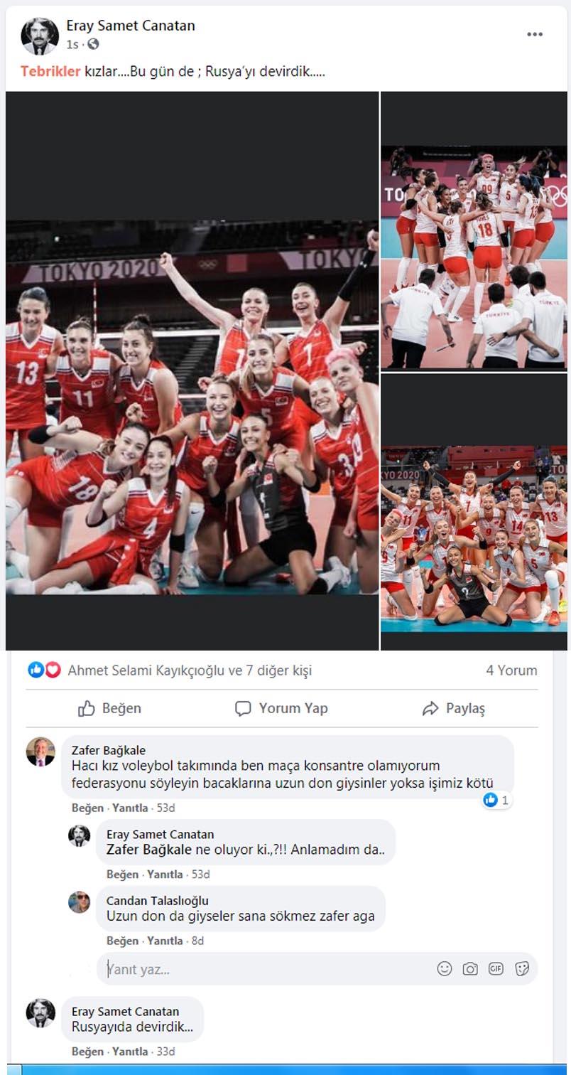 AKP'nin Kayserili siyasetçilerine yakınlığıyla bilinen Bağkale şirketinin sahibi Zafer Bağkale, Facebook hesabından milli voleybolcuların fotoğrafın tepki çeken bir yorum yazdığı ortaya çıktı.