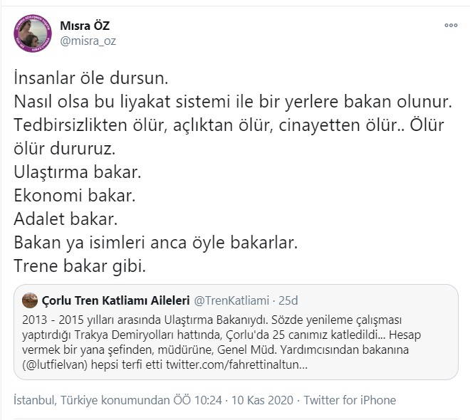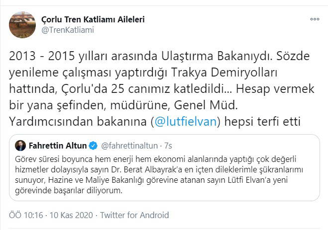 “2013 - 2015 yılları arasında Ulaştırma Bakanıydı. Sözde yenileme çalışması yaptırdığı Trakya Demiryolları hattında, Çorlu'da 25 canımız katledildi... Hesap vermek bir yana şefinden, müdürüne, Genel Müd. Yardımcısından bakanına (@lutfielvan) hepsi terfi etti.”